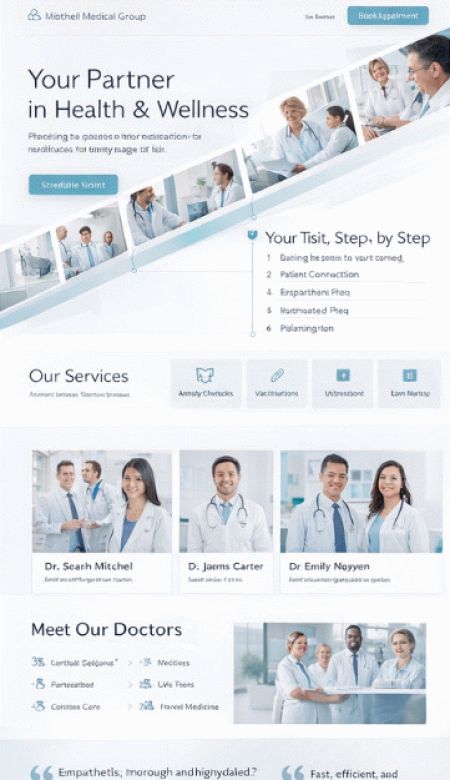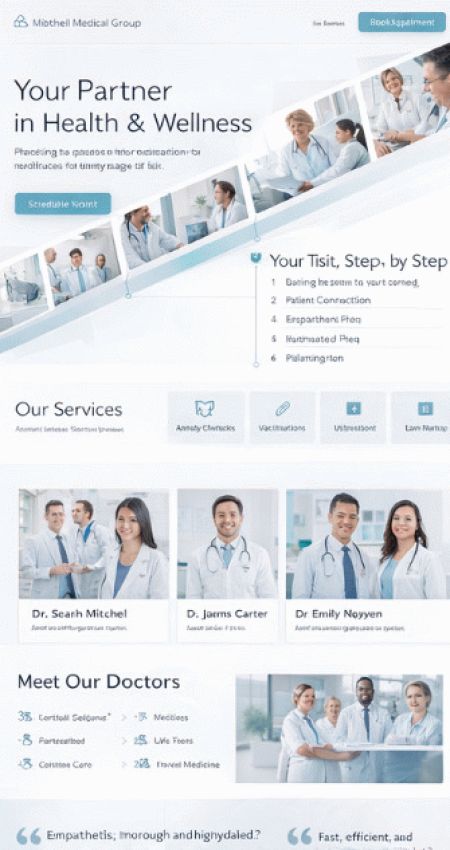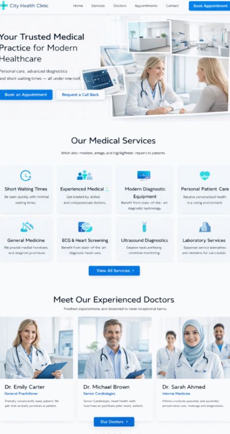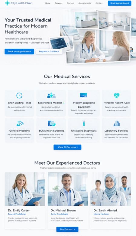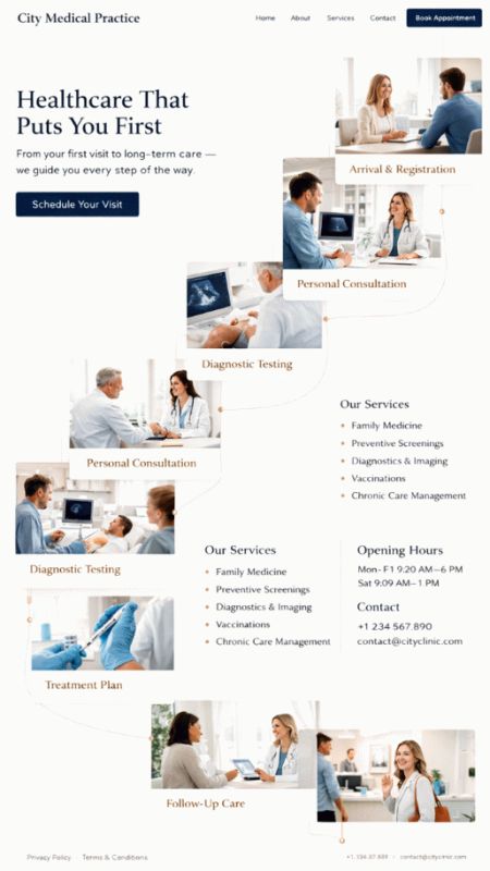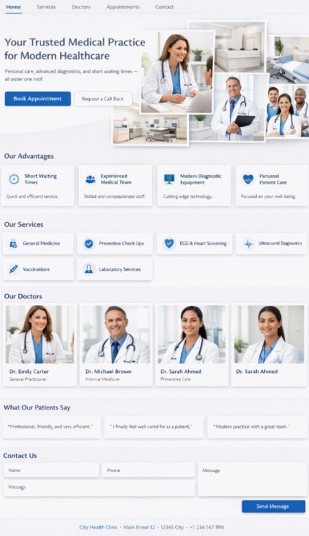 Presenta il tuo studio in modo professionale: specializzazioni, offerta di servizi, team, sedi, orari e modalità di contatto. Completa con appuntamenti online, moduli per nuovi pazienti e informazioni chiare sui processi. Opzione con area notizie, multilingue, aree pazienti protette e pagine documenti (ad es. moduli informativi, avvisi, download).